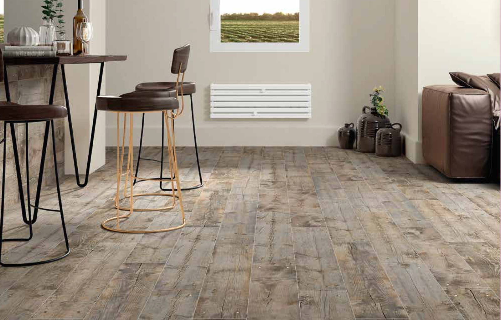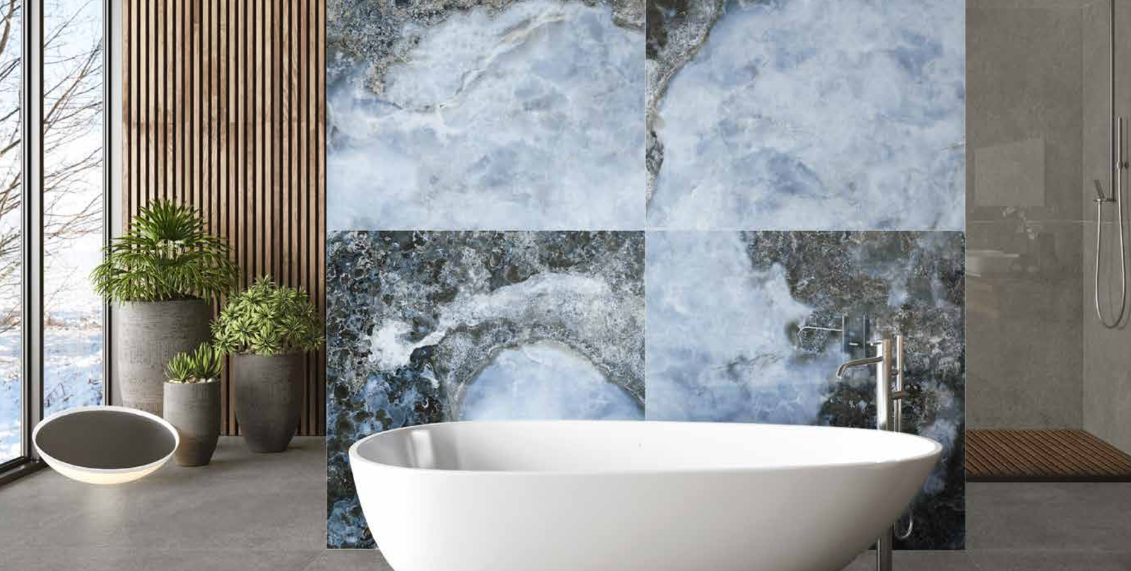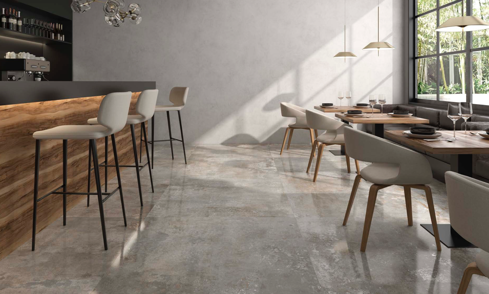 A espessura de 6 mm é a principal característica que define esta coleção. Séries de madeira, cimento e pedra unem-se para projetar espaços exteriores graças às suas excelentes propriedades antiderrapantes e resistentes.